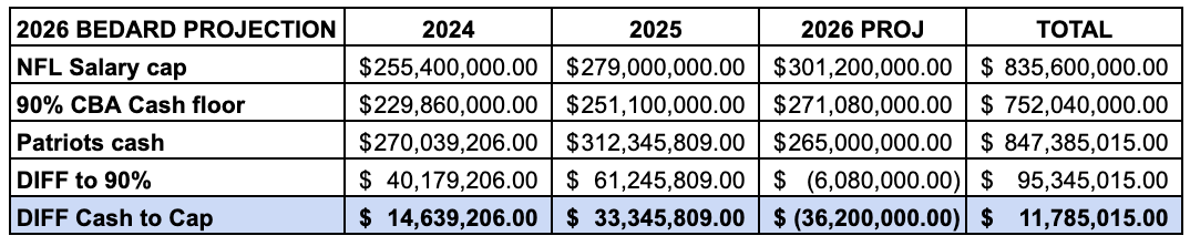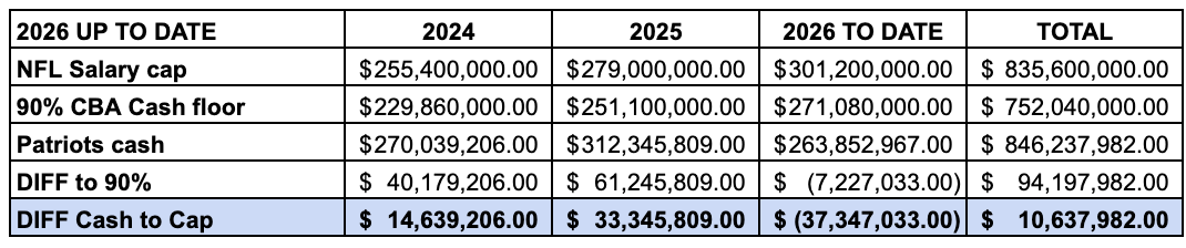 • It's pretty eerie how predictable the Patriots' spending turned out to be. In the last CBA three-year period, 2021-23, the Patriots ended up +$6.5 million cash over cap. This time? +$10.6 million.