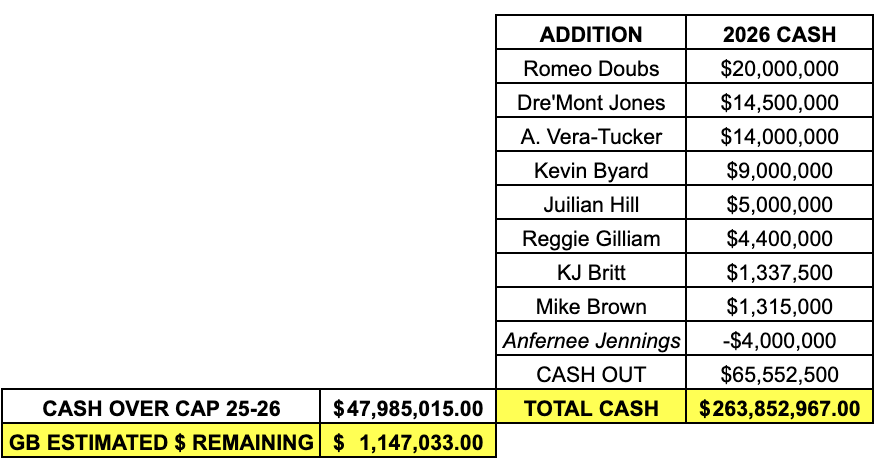 We're still waiting on a few contracts (Byard, Hill) to nail down exactly how much 2026 cash the Patriots have spent this offseason, but using high estimates, the Patriots have spent about $65 million. Before the offseason started, I predicted the Patriots would seek "a balance between cutting back on spending, Kraft allowing more leeway with the budget, and the departure of some players to give the Patriots somewhere in the vicinity of $50-60 million in cash to spend this offseason." So not too far off. The Patriots basically doubled their cash budget, with cash going out the door (Stefon Diggs, Garrett Bradbury, Jahlani Tavai, Anfernee Jennings). Bradbury and Jennings were mild surprises, but you can see the thinking (Jared Wilson and a high draft pick).