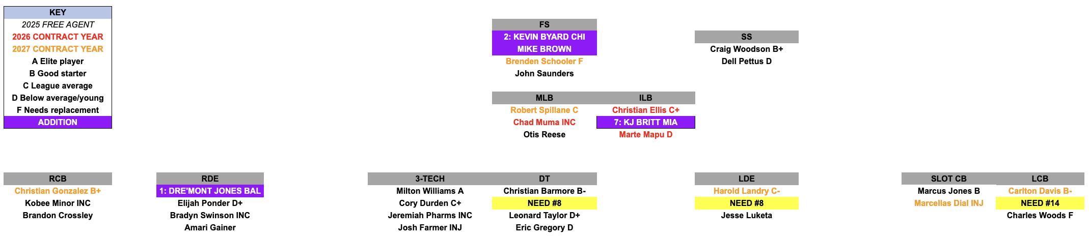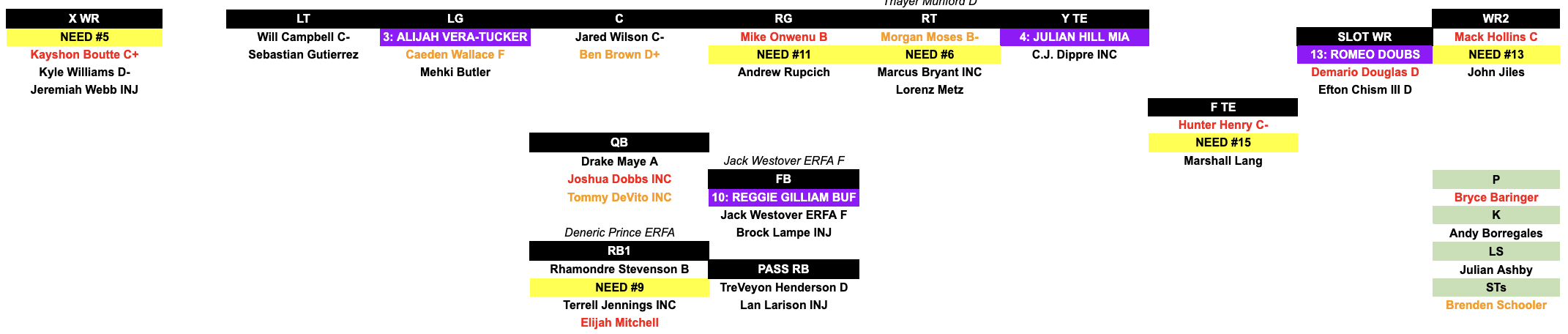 The Patriots maximized the cash available to them. They saved money and got a lot younger, going from Diggs to Dobbs. Dre'Mont Jones is better against the run and has more upside rushing the passer in this scheme than K'Lavon Chaisson. A healthy Alijah Vera-Tucker, with a definite injury risk, greatly improves the offensive line, and Wilson should at least give you what Bradbury did in Year 1, with a much higher ceiling. Byard is an upgrade over Jaylinn Hawkins, and Byard needs zero runway to acclimate to this scheme. Hill's blocking gives Hunter Henry a chance to be much better in the pass game for the entire season (Henry looked worn down by all the blocking at the end of the season). Reggie Gilliam, and Hill, should help solve all the short-yardage and red zone running issues.
