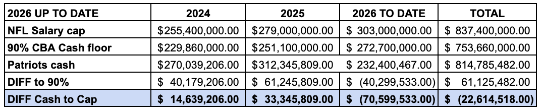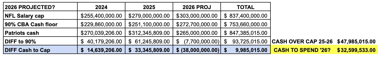 I don't know this for a fact, but it sure seems like Kraft looks in three-year increments because that's what the CBA lays out in terms of the 90% cap/cash spending floor. The 2026 league year is the final year of this three-year period.