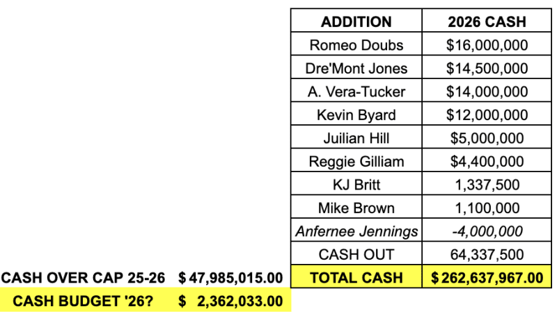 After being $48 milllion cash over cap the previous two years, the Patriots are -$36 million right now. So they are $12 million cash over cap during this 3-year window. ... Actually, I forgot about Anfernee Jennings' release, which frees up $4 million more cash. Updated estimates: